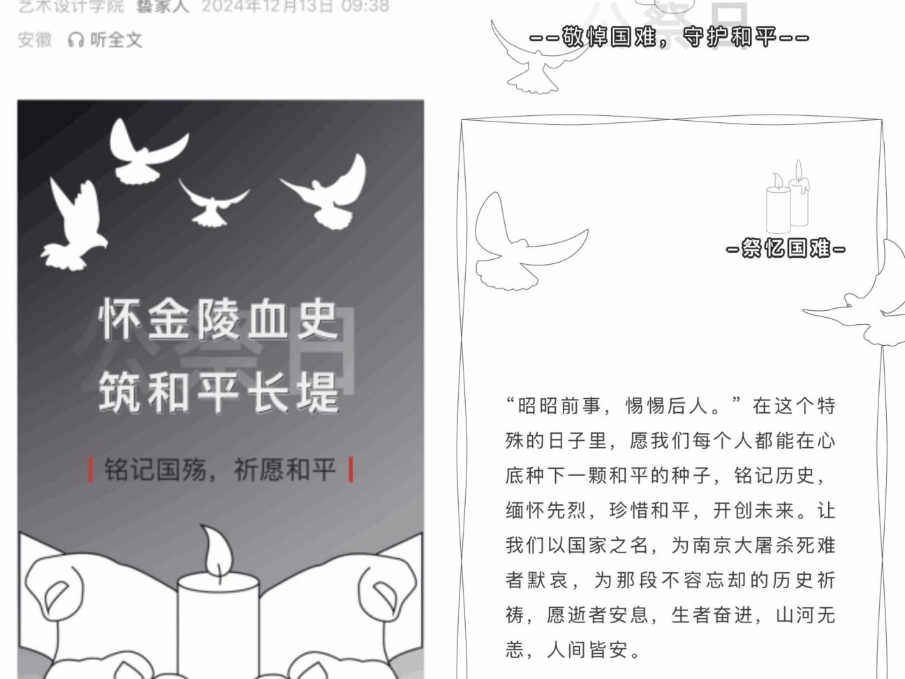 国行公祭,法立典章。2024年12月13日是第11个南京大屠杀死难者国家公祭日。为加强对青年学生的爱国主义教育,引导青年学生弘扬民族精神、牢记历史责任,树立铭记历史,勿忘国耻,珍爱和平,自强不息的坚定信念,12月13日,学院组织开展了”勿忘国之殇 吾辈当自强”国家公祭日主题活动。