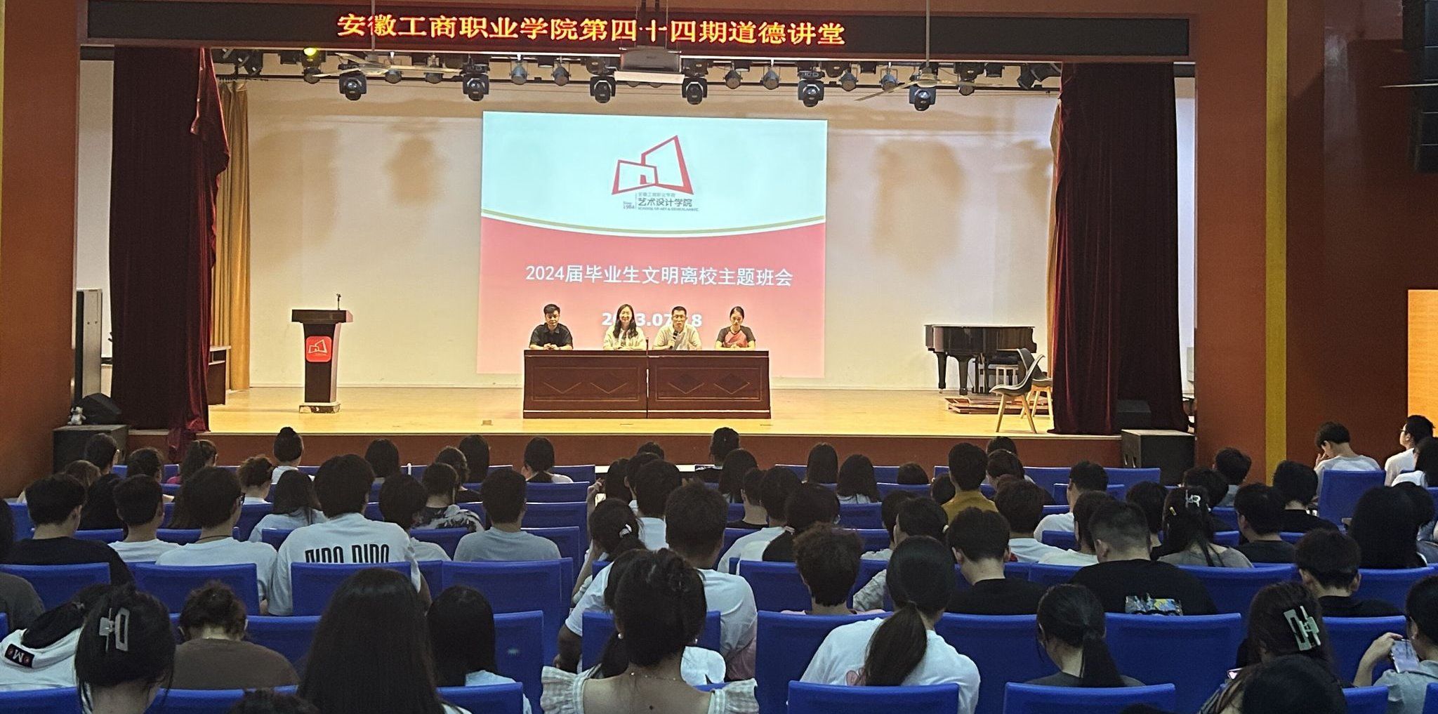 文明离校,聆听在校期间的最后一节报告。7月18日晚,艺术设计学院在庐阳校区大礼堂召开文明离校系列报告。赵文卿老师向同学们强调了实习和就业方面的注意事项,并嘱咐学生在找工作的时候要有辨别力,谨防诈骗。张军老师向学生们提出离校前需要交接的工作,强调要积极服从学院的组织和安排,按规定办好各项离校手续,要做到离校前不酗酒、不闹事、不晚归。学院党总支副书记张乐强调了毕业生在未来学习、实习、生活中需要注意的事项,鼓励学生要将个人理想与时代发展相结合,牢记使命,勇担责任,用实际行动在自己的岗位上绽放绚丽之花。