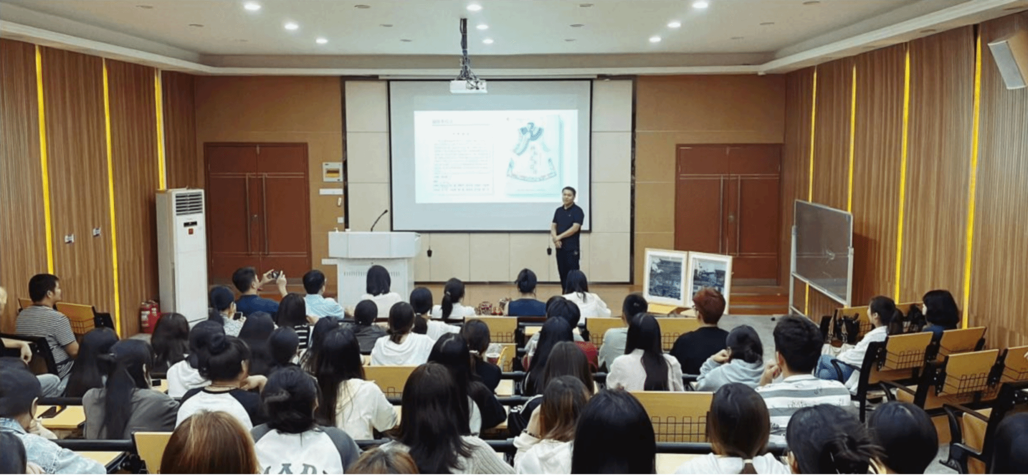 袁金龙围绕拼布艺术历史发展与现状开启本期讲堂,延展到牛仔拼布创新设计,展示了以设计创新为手段,将中国传统拼布艺术与生活相结合,将废旧衣物进行回收再利用,用拼布的方式呈现,让设计更好的贴近生活、服务社会。现场带来了实物作品以及若干藏品,吸引了在场的老师和同学。在讲座过程中,袁金龙希望同学们立足专业,注重技能,做好中国优秀传统文化的传承工作。