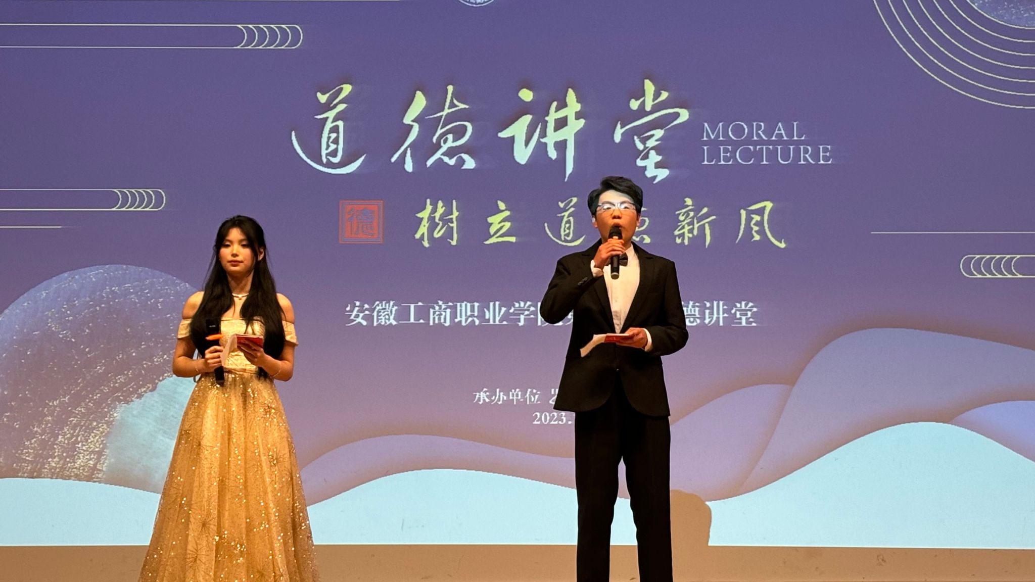 12月6日晚,由校党委宣传统战部主办、艺术设计学院承办的第五十期道德讲堂在庐阳校区时间剧场举行。校党委委员、党委宣传统战部部长、艺术设计学院党总支书记孔成、党总支副书记、院长魏芬、副书记张乐及全体辅导员和师生500余名同学一起参加了本次活动。
