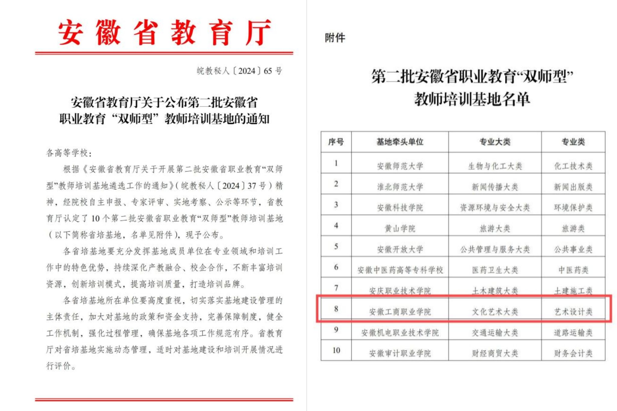 近日,省教育厅发布《安徽省教育厅关于公布第二批安徽省职业教育“双师型”教师培训基地的通知》,安徽工商职业学院入选第二批安徽省职业教育“双师型”教师培训基地(艺术设计类)。全省共10所高校(本科5所、高职5所)入选。