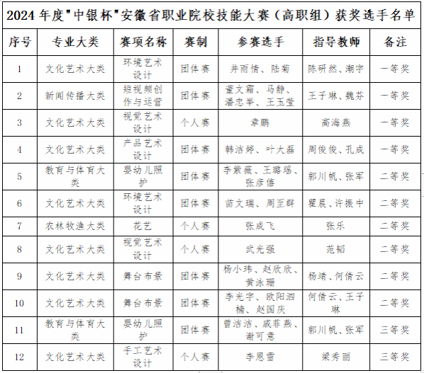 在安徽省教育厅主办的2024年“中银杯”安徽省职业院校技能大赛(高职组)中,艺术设计学院代表队再创佳绩,取得4个一等奖、6个二等奖和2个三等奖的优异成绩。优异成绩的取得体现了我院学生在各项赛事中高超的专业技能水平,展现了学院专业建设的成果。艺术设计学院将继续推进专业群建设,不断提高人才培养质量,助力学校事业高质量发展。