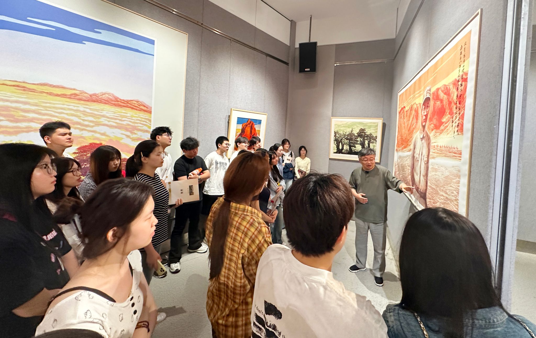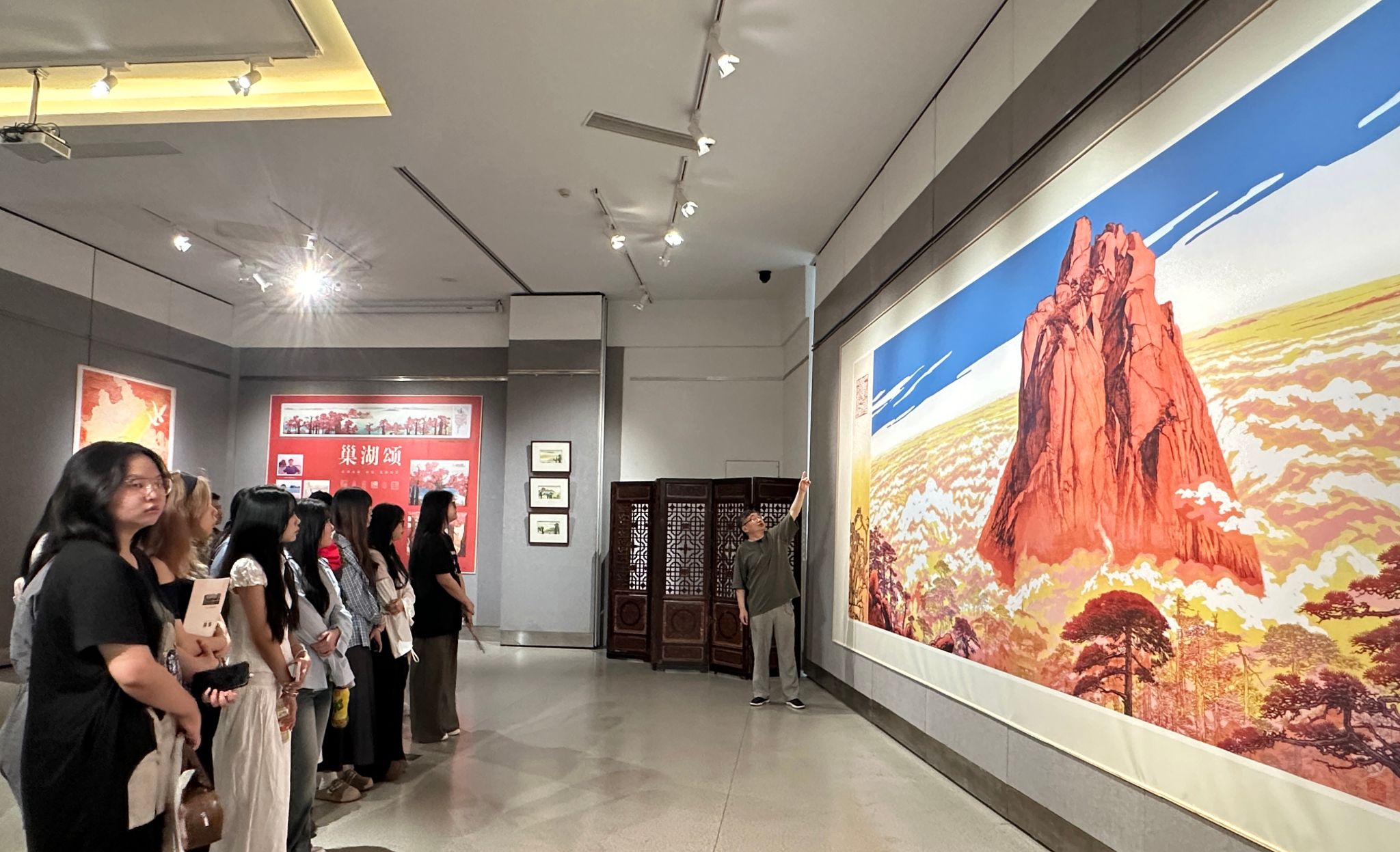 5月22日上午,艺术设计学院广告艺术设计专业50余名师生前往合肥赖少其艺术馆,参观“纪念赖少其先生诞辰110周年——皖韵徽风·师晶艺术展”。此次活动以“美育润心,思政铸魂”为主题,通过实地观展引导学生深入理解徽派艺术的文化内涵与创新精神。师晶老师亲自为师生导赏近两小时,从版画、新徽派版画与设计、传承与创新等多角度解读作品,为同学们带来一场生动的艺术与思政教育融合的实践课堂。