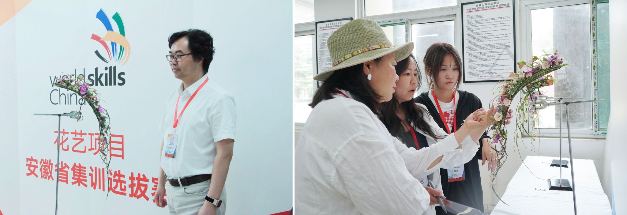 为全力备战2025年9月在河南郑州举办的中华人民共和国第三届职业技能大赛,全面提升参赛队伍的专业技能与艺术素养,6月6日至7日,由安徽工商职业学院与校企合作单位合肥会心花卉有限公司联合承办的安徽省集训队选拔赛在我校花艺实训基地顺利举行。安徽工商职业学院党委委员、艺术设计学院党总支书记、安徽省技能大赛花艺赛项专家组组长孔成担任集训选拔赛裁判长,艺术设计学院教师韦鸾鸾、翟雨娟,会心花卉公司郑贤永及安徽职业技术学院鲍阿赛共同担任裁判。来自省内三支优秀队伍的选手经过为期14天的集中训练与严格考核,圆满完成选拔任务,为后续冲刺全国大赛奠定坚实基础。