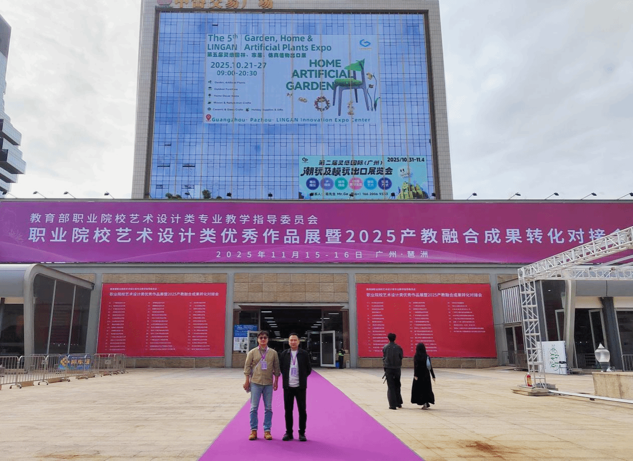 11月14日至16日,“全国职业院校艺术设计类优秀作品展暨2025年产教融合成果转化对接会”于广州琶洲灵感创新展馆顺利召开。本次活动由教育部职业院校艺术设计类专业教学指导委员会主办。我校艺术设计学院教师赵中华、范韬赴广州参展,并与来自全国的同行进行了深入交流。