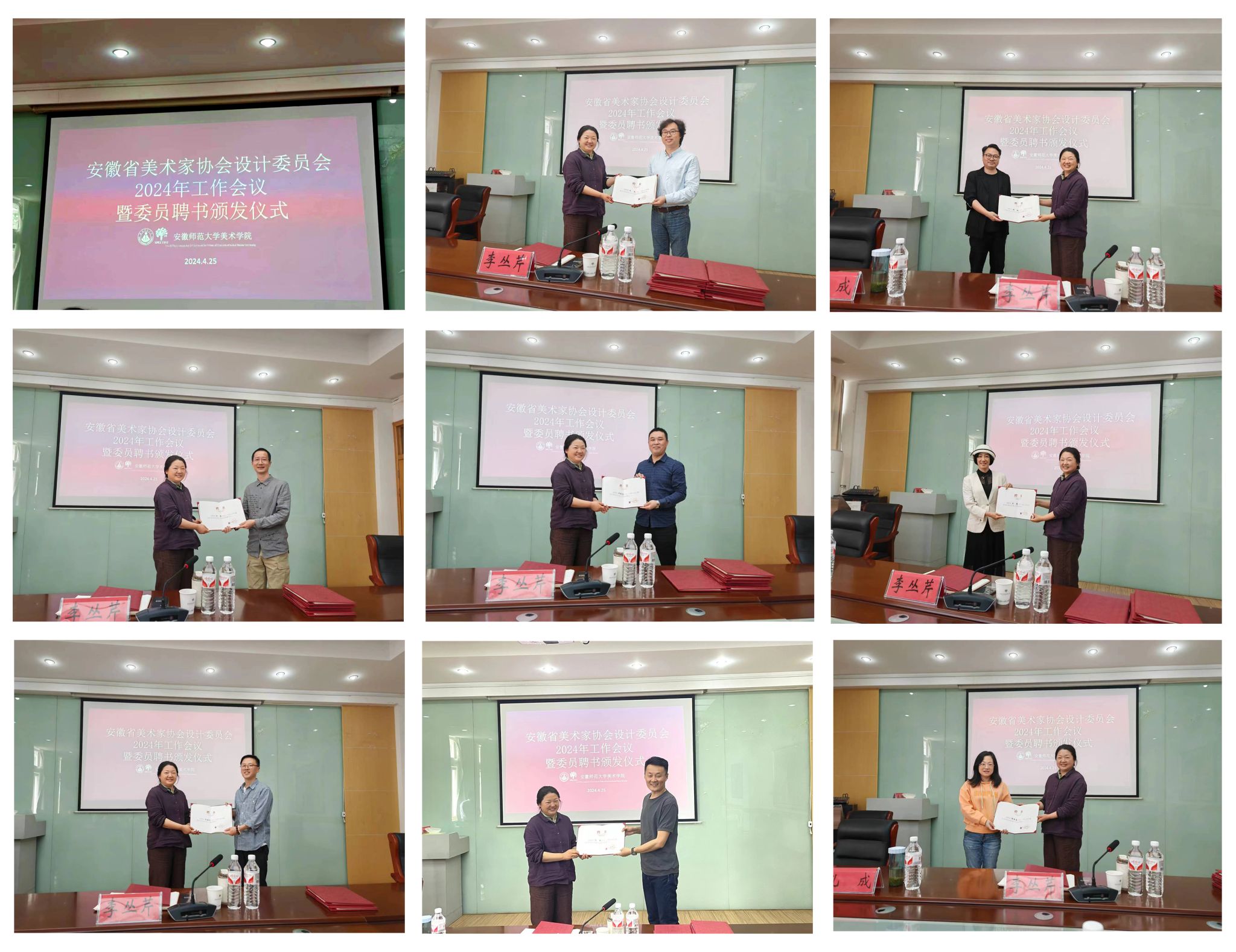 会议期间,各位委员结合各自单位的设计与设计教育工作实际,围绕年度工作计划提出了许多宝贵的意见和建议。大家一致认为,设计艺委会应紧紧围绕安徽省文化强省建设目标,聚焦文化创意设计,在视觉传达设计、环境设计、产品设计、服装与服饰设计、数字艺术设计、非遗及非遗文创设计、影视艺术等领域深耕细作,同时加强设计教育方面的研究和指导,推动专业人才培养和教学质量的提升。最后,李丛芹为全体委员颁发聘书。