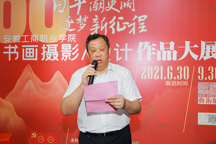 2021年6月30日上午9点30分,由安徽工商职业学院党委主办,校党委宣传统战部、校工会、校团委、艺术设计学院承办的“百年潮更阔·逐梦新征程”安徽工商职业学院庆祝中国共产党成立100周年师生书画摄影与设计作品大展在庐阳校区合瓦·VISION艺术馆隆重开幕。