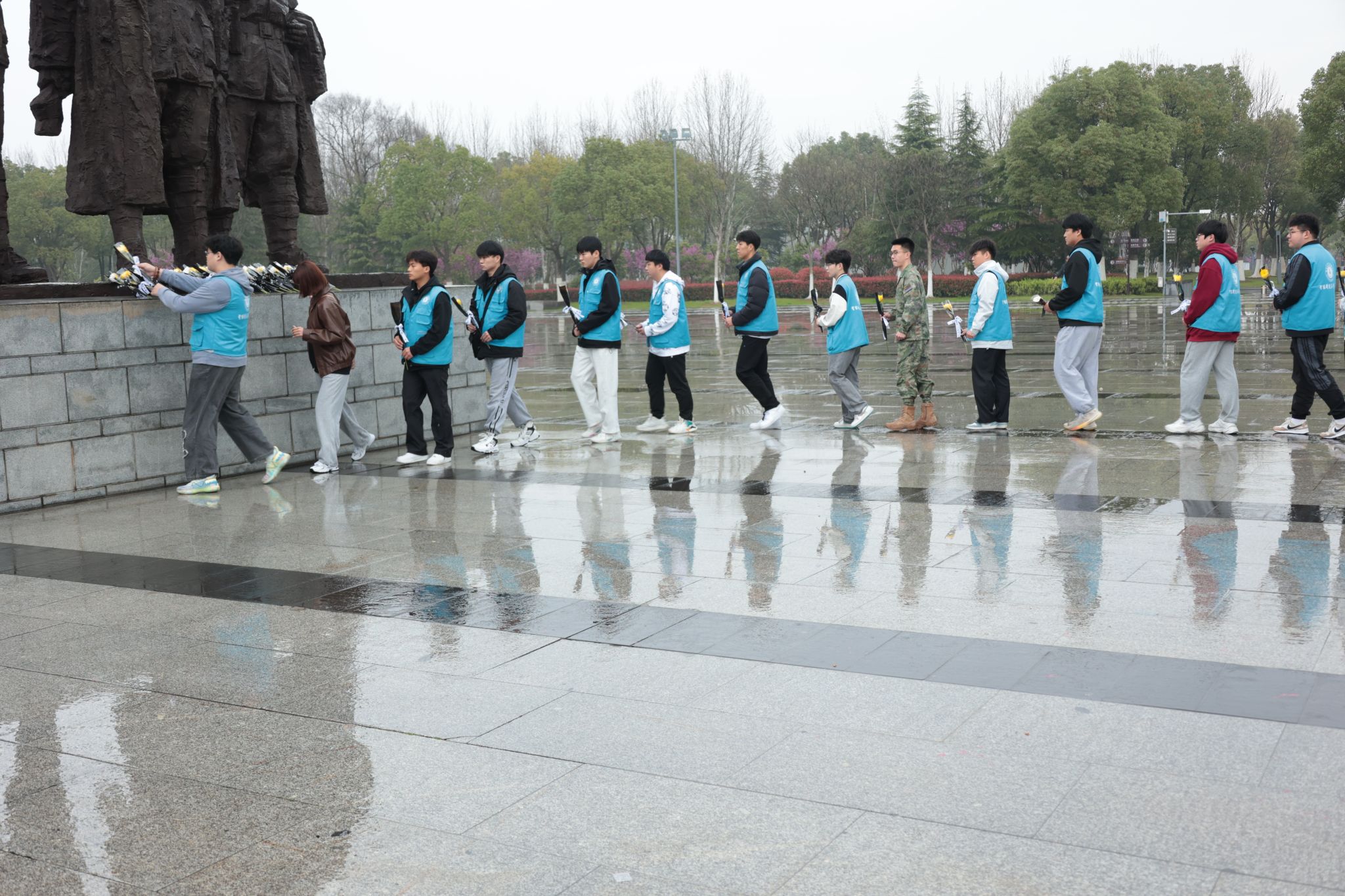 渡江战役纪念馆坐落在安徽合肥美丽的八百里巢湖之畔。上午9点,怀着对烈士们的无限崇敬,学院师生冒着蒙蒙细雨来到了广场雕像前,瞻仰了邓小平、刘伯承、陈毅、粟裕、谭震林五位总前委成员的巨型塑像。高大的群雕生动形象地展现了五位总前委运筹帷幄、决胜千里,指挥百万雄师横渡长江天堑的雄才大略与宏伟气度。随后学院师生面向烈士纪念碑,敬献鲜花,以示哀思和悼念,团员青年重温入团誓词,深刻缅怀革命先烈的丰功伟绩。
