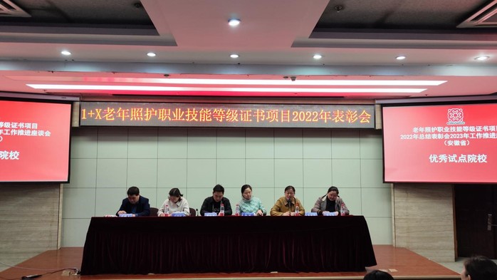 3月19日,老年照护职业技能等级证书安徽考评站2022年总结表彰会暨2023年工作推进会在安徽医学高等专科学校成功召开。中国社会福利与养老服务协会、北京中福长者文化科技有限公司考评部主任徐向前、老年照护职业技能等级证书安徽考评站负责人安徽康乐年华健康养老服务有限公司经理张鹏飞、安徽医学高等专科学校教务处长朱霖、教务副处长吴晓红和护理学院院长朱延玲出席会议。安徽中医药高等专科学校、合肥职业技术学院、铜陵职业技术学院、淮南职业技术学院等23所中、高职院校领导和项目负责老师出席会议。会议由安徽考评站工作人员陈丹主持。