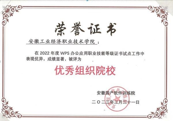 4月1日,由安徽省职业与成人教育学会信息化专业委员会和安徽国产软件训练院、安徽银领人才研究院组织召开职业教育服务“信创”产业发展交流研讨会,安徽工业经济职业技术学院获评2022年度WPS办公应用职业技能等级证书试点工作优秀组织院校。